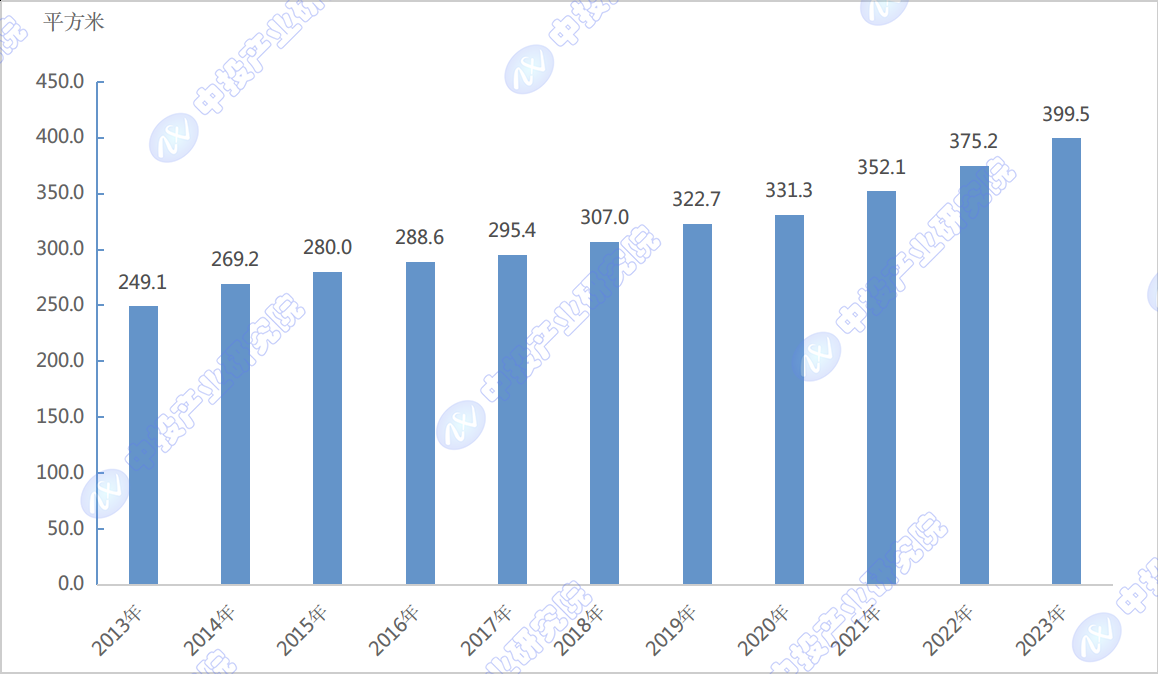图表:2013-2023年全国平均每万人群众文化设施建筑面积