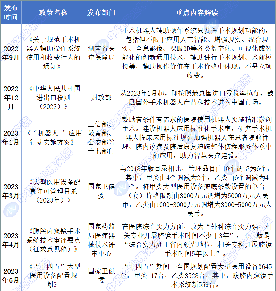 (六)设备配置优化:《大型医用设备配置许可管理目录(2023年)》的调整,减少了管理品目,提高了价格限额,这有助于简化手术机器人等大型医用设备的配置流程,促进了医疗资源的合理分配和使用。