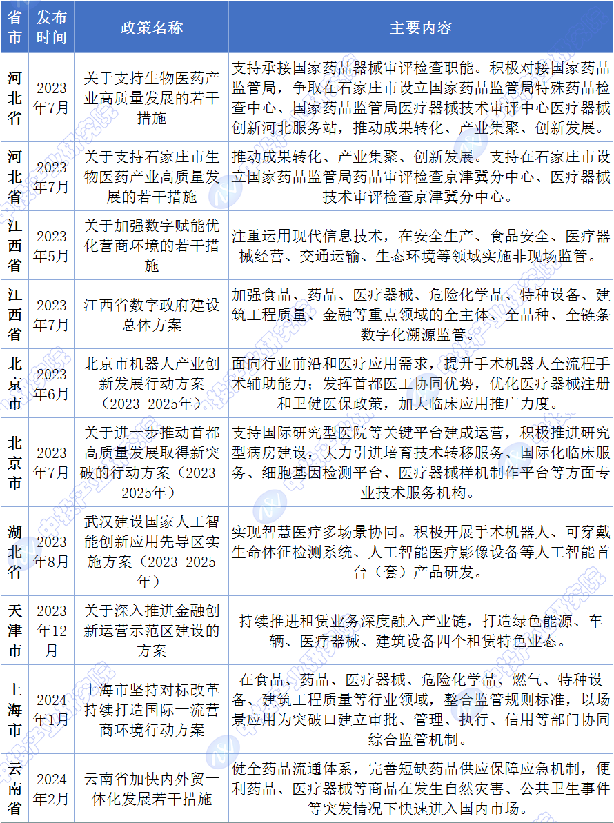 (三)产业发展支持:《“机器人+”应用行动实施方案》等政策鼓励医院使用机器人实施精准微创手术,建设机器人应用标准化手术室,研究临床应用标准规范,加强机器人在患者院前管理、院内诊疗及院后康复追踪整体伤程服务体系中的应用,助力智慧医疗建设。
