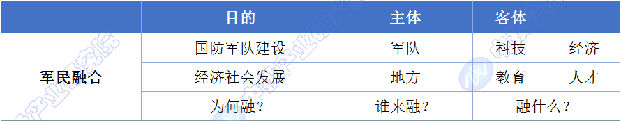 军民融合是将国防和军队现代化建设深深融入经济社会发展体系之中,全面推进经济、科技、教育、人才等各个领域的融合,在更广范围、更高层次、更深程度上把国防和军队现代化建设与经济社会发展结合起来,为实现国防和军队现代化提供丰厚的资源和可持续发展的后劲。军民融合主要分为三层含义:一是“军转民”,就是军事技术在民间的使用;二是“民参军”,即民营主体参与军工市场(同时也包含民间资本进入国防科技工业投资建设领域,民营企业有序参与军工企业的改组改制);三是军民协同,军民融合协同创新是推进军民深度融合发展的重要领域。
