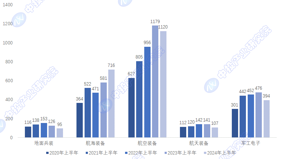 图表:2020-2024年国防军工二级子行业营业收入对比