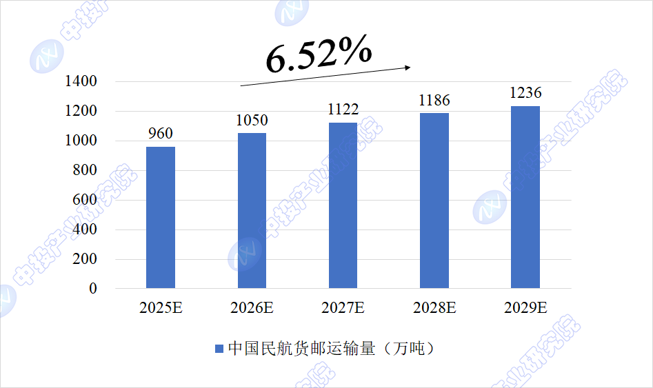 中投产业研究院预计,2025年中国民航货邮运输量将达到960万吨,未来五年(2025-2029)年均复合增长率约为6.52%,2029年将达到1236万吨。