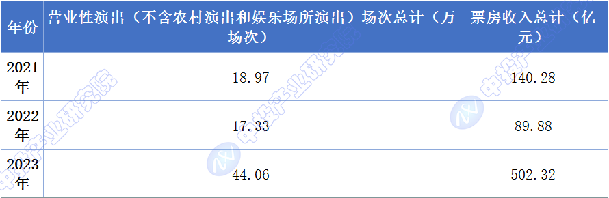 图表:2021-2023年全国演出(不含农村演出和娱乐场所演出)场次及票房收入