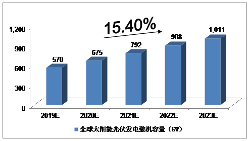 我们预计,2019年全球太阳能光伏发电装机容量将达到570GW,未来五年(2019-2023)年均复合增长率约为15.40%,2023年全球太阳能光伏发电装机容量将达到1,011GW。
