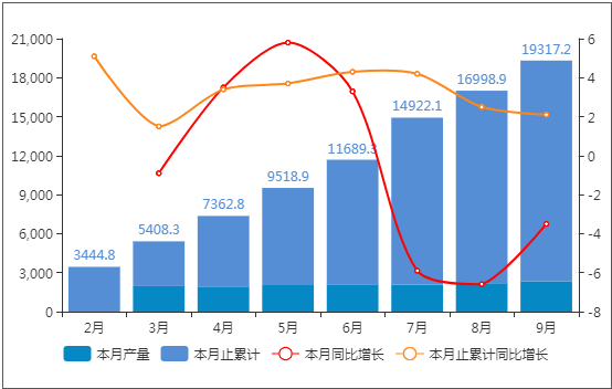 中投产业研究院发布的《2019-2023年中国饲料工业投资分析及前景预测报告》显示,2019年1-9月,全国饲料累计产量为1.93亿吨,同比增长了2.1%。其中,9月份饲料产量最高,为2325.70万吨,同比下降了3.5%;其次是8月份,单月产量为2190.90万吨,同比下降了6.6%;最少是4月份,单月产量为1929.80万吨,同比增长了3.5%。